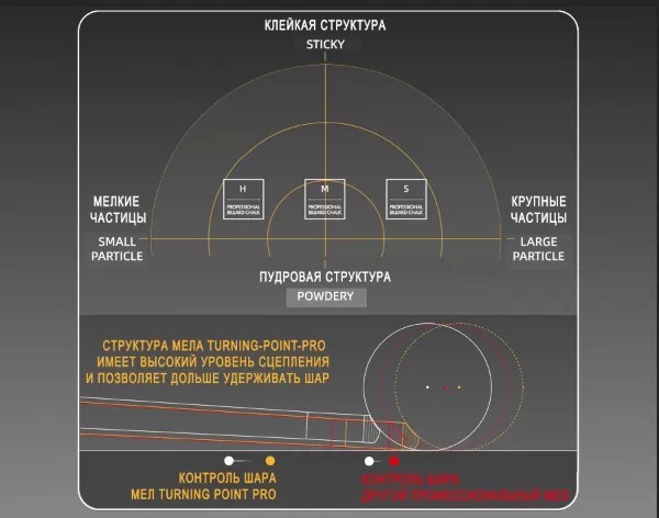 Мел отличают высокие абразивные свойства, он создает лучшее трение и уровень сцепления между жесткой наклейкой и шаром, минимизируя вероятность неудачного удара.