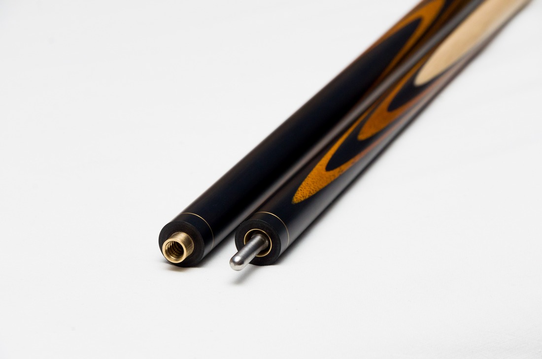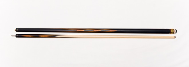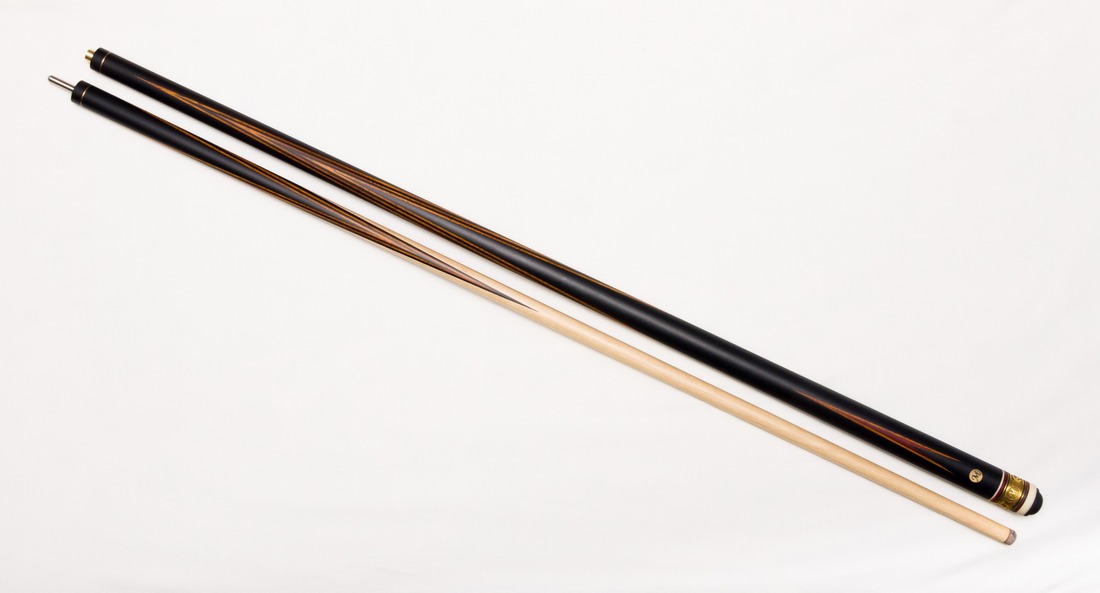 Яркий, контрастный бильярдный кий из черного граба с применением древесины белинго, с улучшенными игровыми характеристиками за счет использования длинного запила